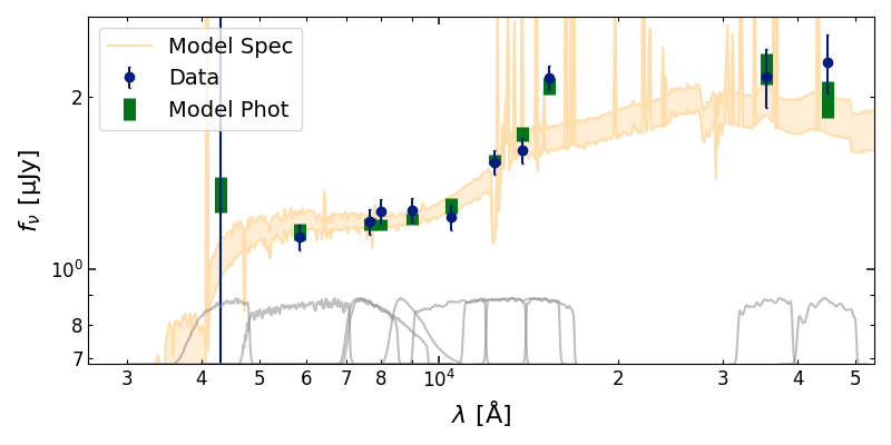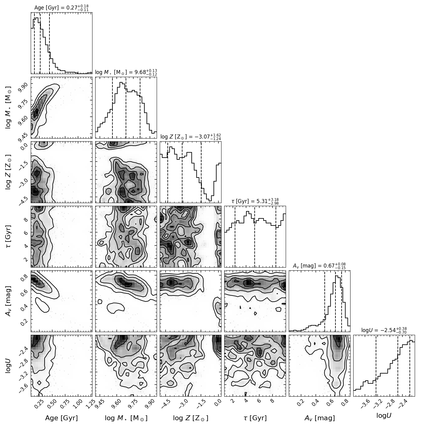 Leveraging the HETDEX dataset, I studied the stellar population properties of a sample of Lyman-alpha emitting galaxies (LAEs) between redshifts 1.9<z<3.5. I used spectral energy distribution (SED) fitting techniques to constrain the posterior distributions for galaxies’ masses, star formation rates, dust contents, and more within a Bayesian framework. Such a technique explores the full galaxy parameter space using a Markov chain Monte Carlo method to find which parameters produce a spectral model best reflected by the observed data (in this case, from the Hubble Space Telescope). The pictures below show a model fit to the data as well as a “corner” plot showing the posterior distributions and their interdependencies.